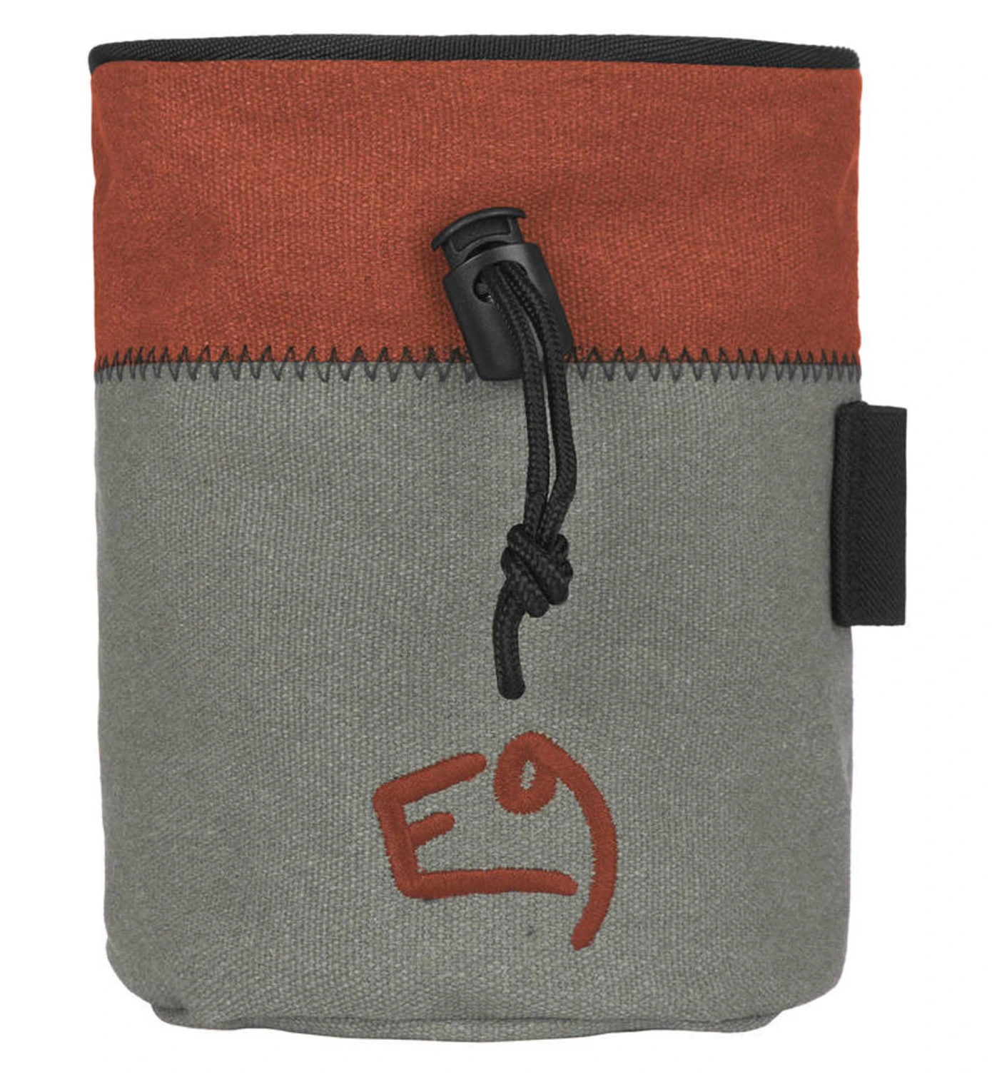 von E9 ist eine breite zylindrische Kreidetasche mit einer starren Öffnung und verstecktem Kordelzugverschluss. Das Design fällt sowohl in der Turnhalle als auch an der Kletterwand auf.