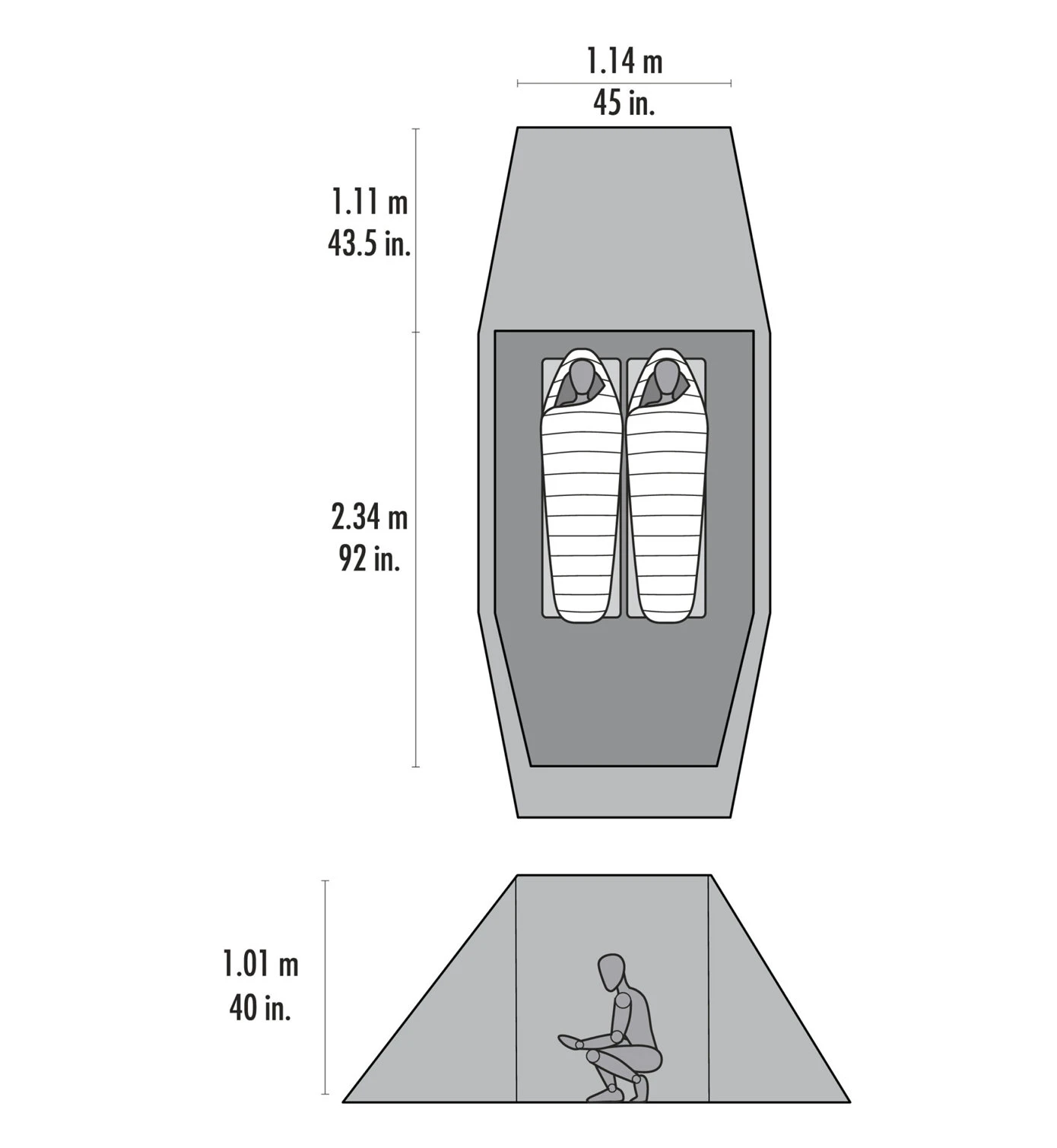 - externe Apsis mit der Möglichkeit, Rucksäcke und Ausrüstung trocken zu halten, ohne sie im Zelt tragen zu müssen