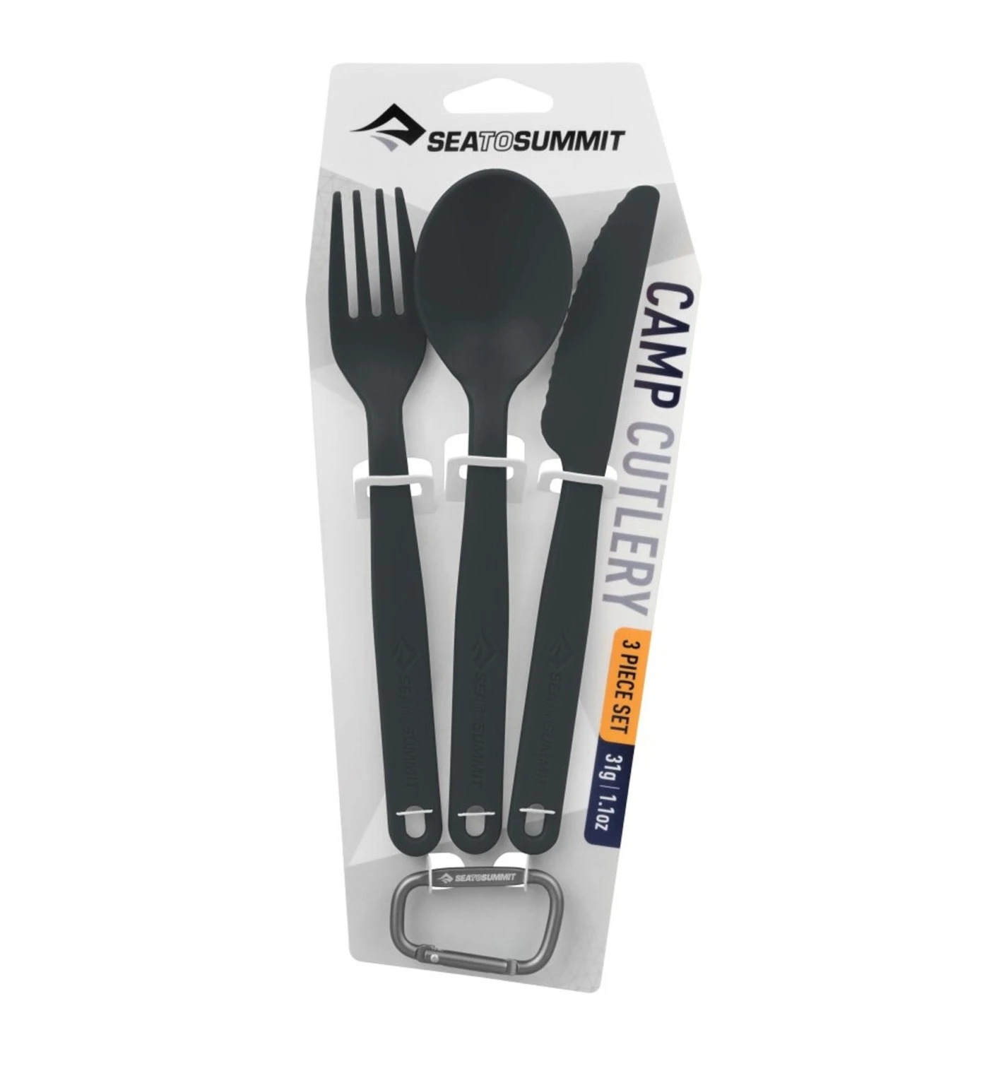 Aluminium-Karabiner, der das Besteck zusammenhält.
